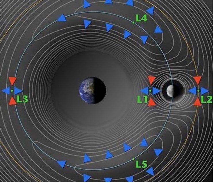 Точки L4 и L5 образуют равносторонние треугольники как с Луной, так и с Землей. Они вращаются вокруг Земли.