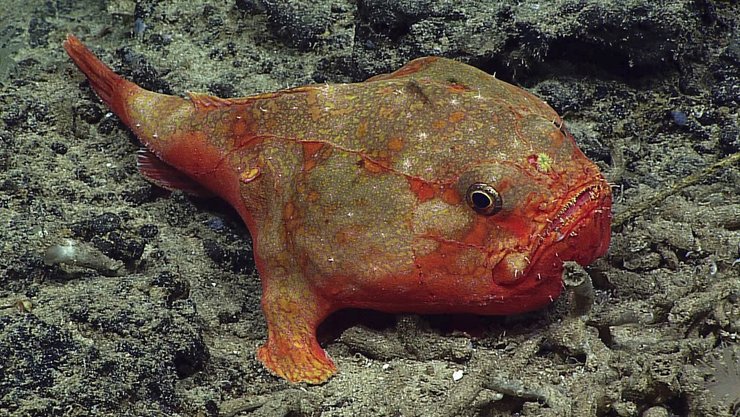 Морская жаба (Chaunacops coloratus) - рыба, похожая на красный пузырь с шипами. Из-за опущенных уголков рта она кажется вечно недовольной. "Эта оранжевая морская жаба уже готова к Хэллоуину, не так ли?", - пишут ученые из Национального морского заповедника США (NOAA).