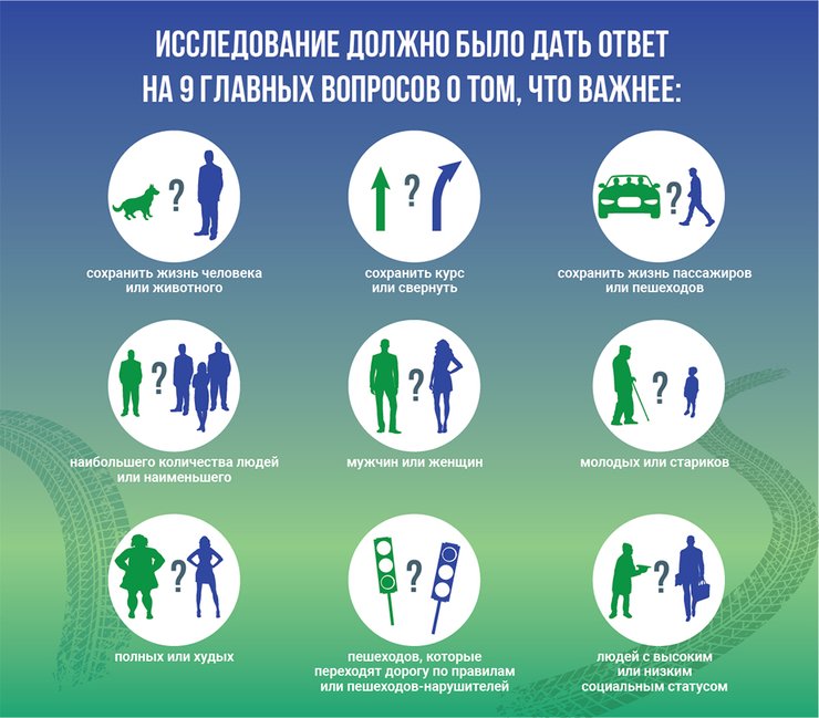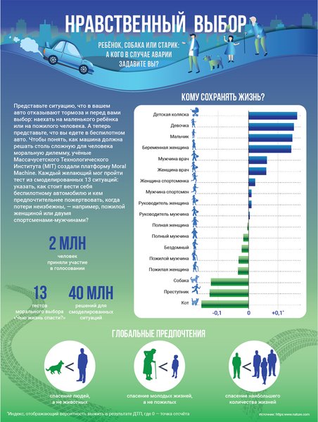 Ученые Массачусетского Технологического Института создали платформу Moral Machine, где каждый желающий мог пройти тест из смоделированных 13 ситуаций: указать, как стоит вести себя беспилотному автомобилю и кем предпочтительней пожертвовать