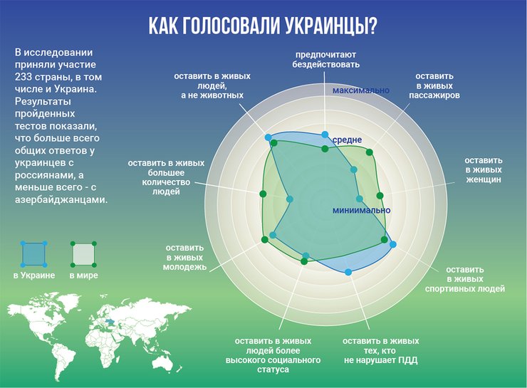 Украинцы не особо отдают предпочтение в том, чтобы спасти как можно больше людей, в отличие от всего остального мира, зато чаще других подарят жизнь тем, кто не нарушает ПДД. Реже других в среднем по миру будут спасать женщин, пешеходов и молодых людей.