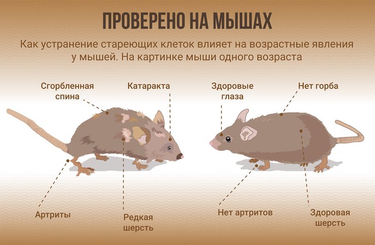 Ближе всего к выводу на рынок разработка одной из ведущих биотехнологических компаний Unity Biotechnology. Их версия эликсира вечной молодости — сенолитик — медицинский препарат, убивающий стареющие клетки в организме. Накопление этих клеток считается причиной возрастных изменений и заболеваний, характерных для пожилых людей: атеросклероза, артритов, дегенерации сетчатки, болезни Альцгеймера, многих форм фиброза (утолщения соединительной ткани). Испытания нового средства на животных дали самые обнадеживающие результаты. Когда мышей из одного помета разделили на две группы, а затем одну обрабатывали сенолитиком, другую – нет, оказалось что по прошествии нескольких лет первая группа даже визуально разительно отличалась от второй. У людей этот эффект как раз и называется "выглядеть моложе".
