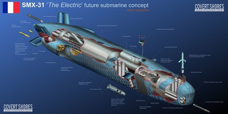 Дизайн новой субмарины SMX-31 вдохновлен формой кашалота, она тяжело вооружена, на ее борту находится большое количество беспилотных машин, и она может функционировать как центр для размещения морских сцецвойск. К тому же такая субмарина сильно автоматизирована, ее команда будет насчитывать всего 15 человек, пишет Популярная механика.
