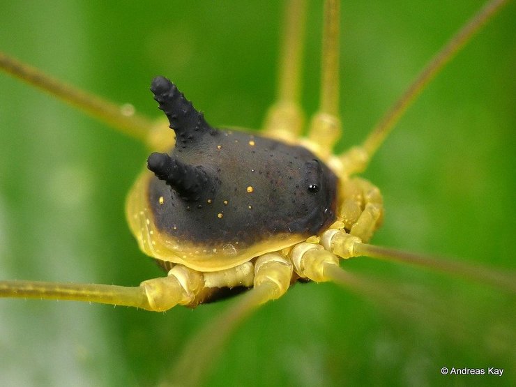 Сенокосцы, отряд членистоногих из класса паукообразных, появились на Земле как минимум 400 миллионов лет назад - раньше динозавров. К сенокосцам относятся 6 650 видов по всему миру. Данный вид изучен довольно плохо, поэтому ученые пока не знают, зачем ему эти фальшивые уши и глаза - вероятно, для устрашения врагов.