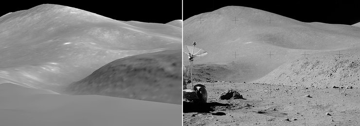 Слева – фотография, сделанная на Луне; справа – изображение, сгенерированное Nvidia – NASA/Nvidia