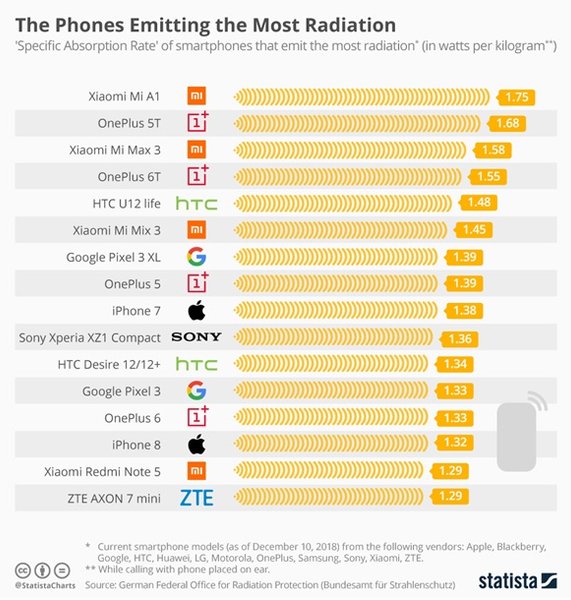 Как пишет Gizchina, на вершине этого антирейтинга находится Xiaomi Mi A1, - он излучает больше всего радиации.