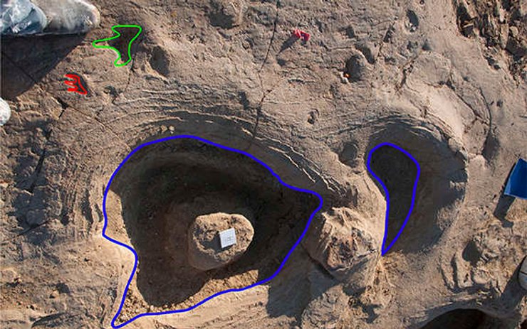 Двадцать следов самых больших следов (до метра в длину) сделаны зауроподом - динозавром высотой до 18 метров и весом до 30 тонн (на фото выделены синим цветом). Отпечатки так хорошо сохранились, что можно разглядеть даже царапины от когтей. Следы орнитоподов (зеленый) и тероподов (красный) гораздо меньше.