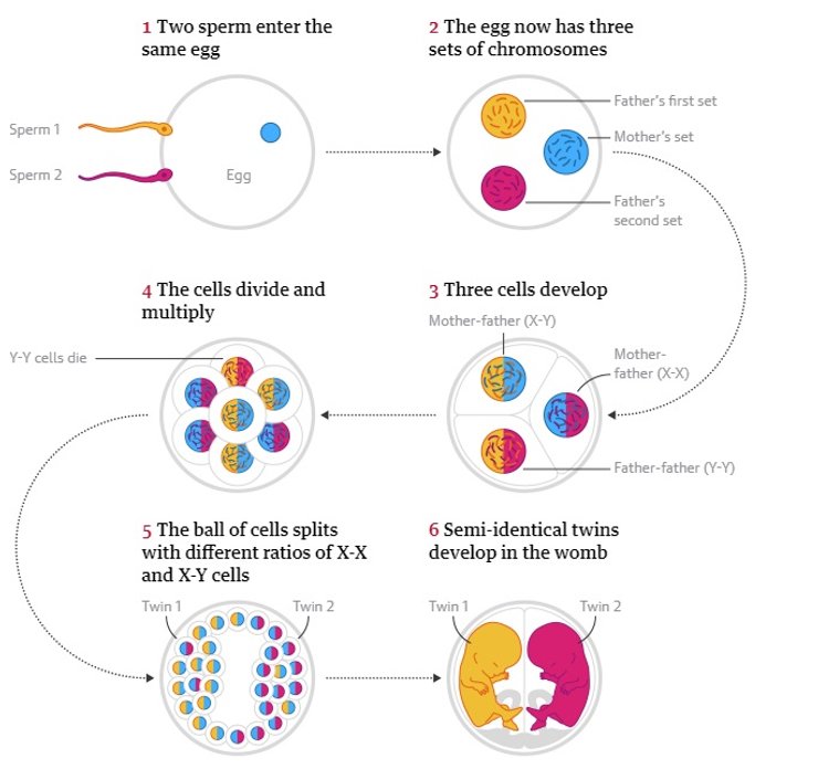 При этом образовались три набора хромосом: один от матери и два от отца. Как правило, три набора хромосом несовместимы с жизнью. Но тут оплодотворенная яйцеклетка, по-видимому, поровну разделила эти три набора на группы клеток, которые затем объединились в три зародыша. В одном из них оказался генетический материал только от отца, и он сразу погиб. В двух других были гены и отца, и матери, поэтому они продолжили развитие.