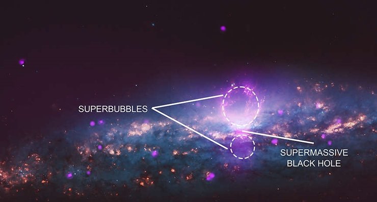 Пузыри диаметром 4900 и 3600 световых лет образовались из-за мощных ударных волн, вызванных столкновением окружающего галактику газа с частицами, ускоренными сверхмассивной черной дырой.