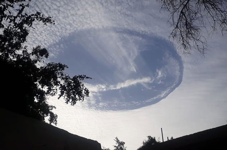 Такие дыры очевидцы часто принимают за НЛО, след от метеорита или формирующийся смерч. На самом деле это редкое, но вполне безобидное явление, обычно вызванное пролетающим сквозь облака самолетом, который оставляет позади себя область низкого давления.