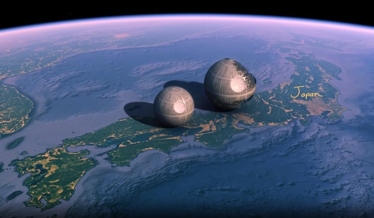 По его расчетам, "Звезда Смерти" уничтоженная Люком Скайуокером и ее обновленная, более мощная и грандиозная версия, могут закрыть собой любой город в Великобритании, а, поставленные рядом, они занимают пол-Японии.