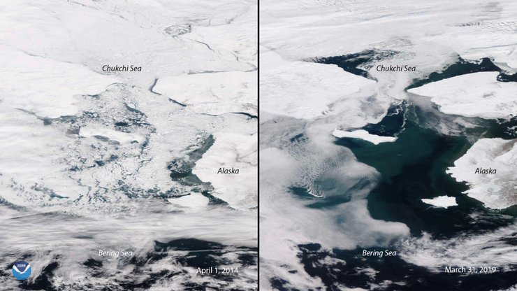 Из-за потепления тают и льды в Беринговом море. В прошлом апреле льда было на 90% меньше, чем обычно, а в этом дела обстоят еще хуже.