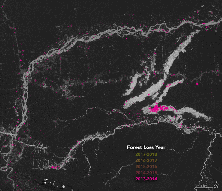 На основе фотографий, сделанных спутниками NASA, ученые создали таймлапс-видео, наглядно демонстрирующее масштабы обезлесения в Перу в период с 2013 по 2018 год. Об этом пишет IFL Science.