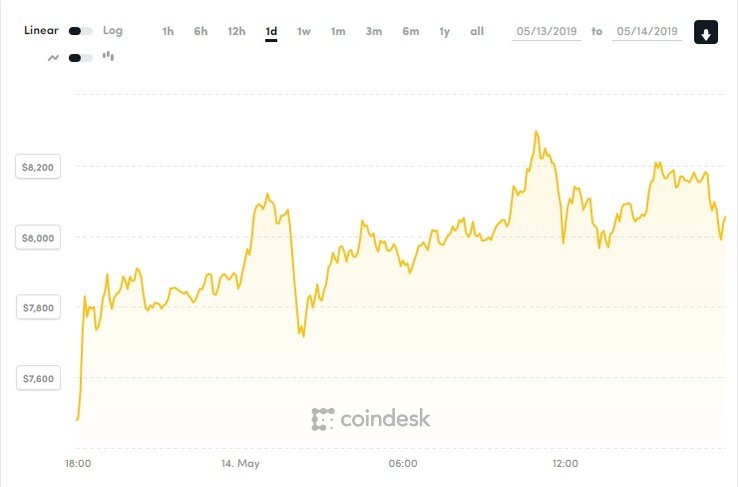 Курс биткоина в полночь 14 мая 2019 года преодолел отметку в $8000 - впервые с 31 июля 2018 года. Об этом пишет Cryptocoinspy.