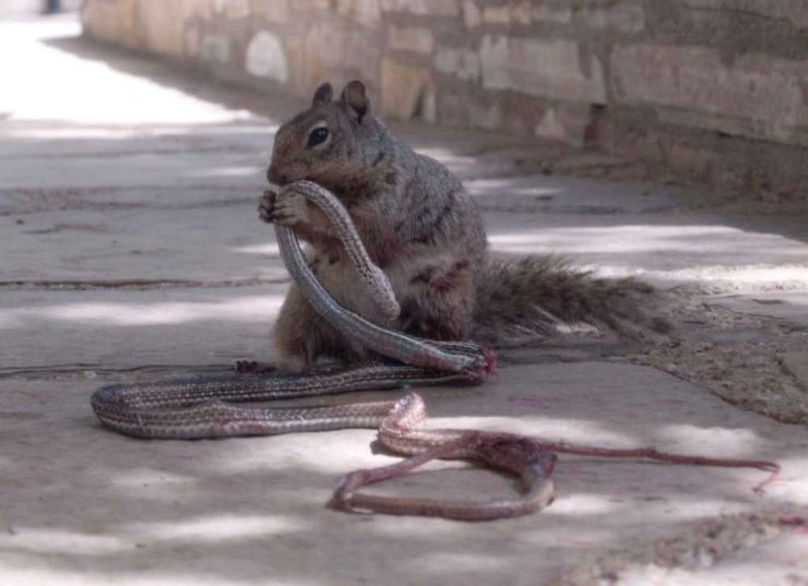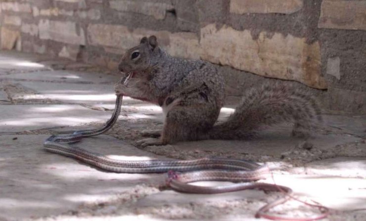На фото изображена самка скалистого суслика (Otospermophilus variegatus) и ее жертва, неядовитая пустынная полосатая змея (Masticophis taeniatus) длиной около 180 сантиметров. Маленькая хищница схватила змею передними лапами чуть ниже головы и задушила ее, после чего приступила к трапезе. Змея оказалась съедена вместе с костями почти полностью, остался лишь пятисантиметровый кончик хвоста.