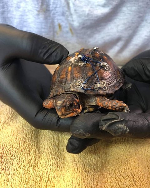 Чтобы зафиксировать части панциря возле трещины, по обе стороны от нее приклеивают застежки от бюстгальтера и стягивают их ниткой. Как только панцирь срастется, застежки снимут и черепах выпустят на волю.
