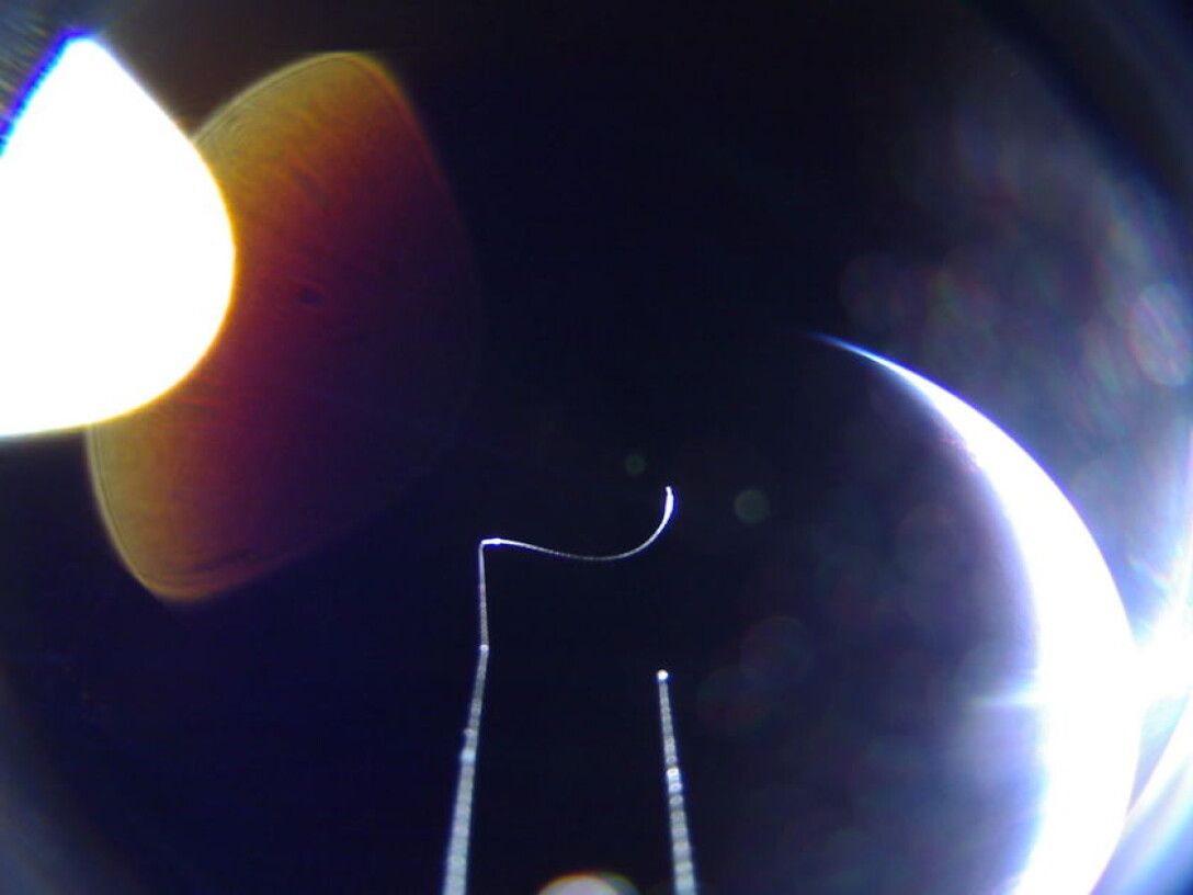 Эта фотография сделана 6 июля 2019 года в 04:41 UTC камерой "рыбий глаз"с полем зрения около 180 градусов, установленной на двухсторонних солнечных панелях аппарата. Белый полумесяц - это Земля, а справа от нее видно Солнце. Блики на фото вызваны рассеянием солнечного света вокруг объектива.