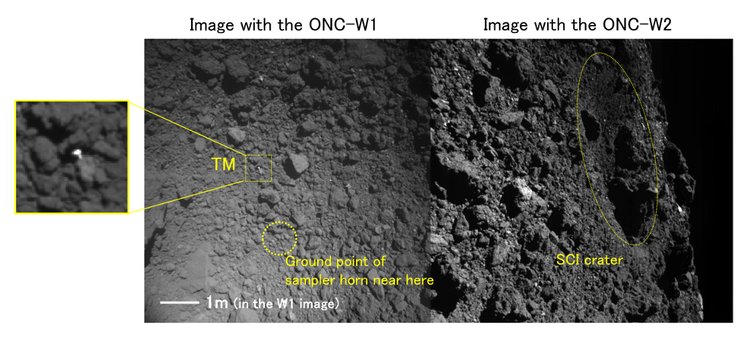 Кратер диаметром в десять метров и глубиной в один метр появился на астероиде в апреле в результате небольшого взрыва, устроенного зондом с помощью медного снаряда и взрывчатки. Ученые надеются, что пробы грунта из глубин астероида будут интереснее поверхностных. Возможно, там удастся даже найти следы воды и органических веществ.