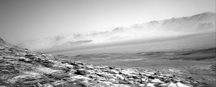 По словам ученых, марсоход изучает скалы вокруг основания горы Шарп, которая возвышается в центре кратера. Новый снимок был получен с помощью правой навигационной камеры марсохода Sol 2573 1 ноября. Так, на снимке запечатлен вид, который открывается позади Curiosity к краю кратера.