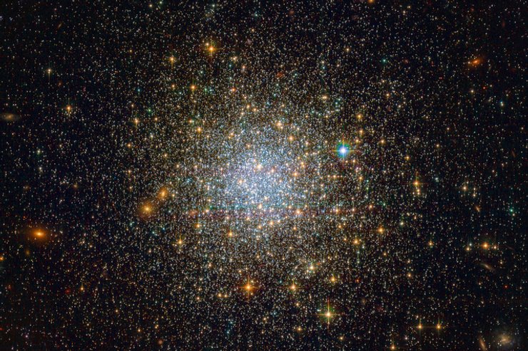Шаровое скопление NGC 1466 состоит из звезд, притягиваемых гравитацией. Звездный шар медленно движется в пространстве на задворках Большого Магелланова Облака — одной из ближайших к Млечному Пути галактик. Голубое свечение испускают звезды с наибольшей массой в шаровом скоплении.