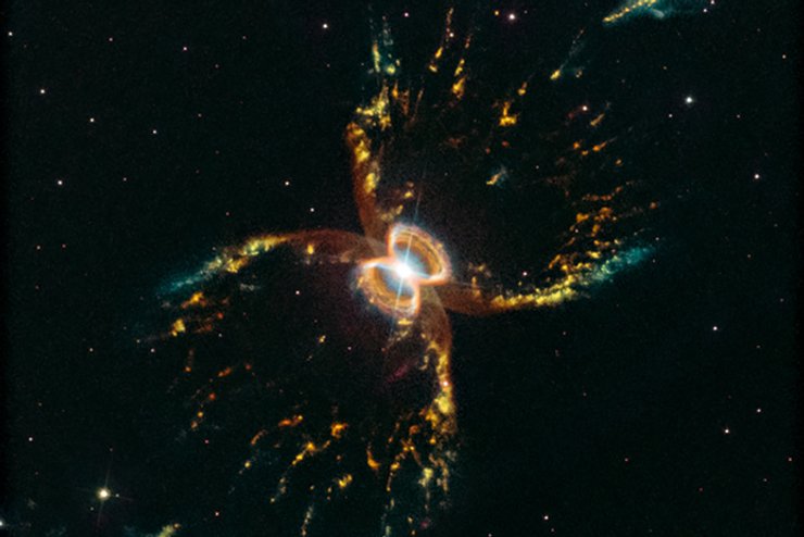 Южная Крабовидная туманность расположена в нескольких тысячах световых лет от Земли в созвездии Центавра. Ее причудливая форма, напоминающая вложенные друг в друга песочные часы, создана двойной звездной системой. Одна из звезд — стареющий красный гигант, а вторая — белый карлик. Первая теряет свои внешние слои, в результате чего обе звезды погружаются в диск из газа.