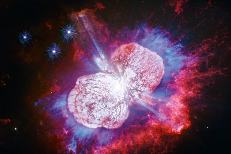 Это двойная звезда-гипергигант Эта Киля, расположенная в 7500 световых лет от Земли. В начале XIX века ее блеск стал быстро увеличиваться, и к 1843 году она была самым ярким объектом ночного неба, не считая Луны, планет и Сириуса. Астрономы назвали это событие "Великой вспышкой". Правда, сейчас звезда находится на грани видимости невооруженным глазом. Недавно Hubble сфотографировал ее в ультрафиолетовом диапазоне. Голубой цвет соответствует свечению атомов магния. Красный — выброшенному во время "Великой вспышки" веществу, в котором доминирует азот.