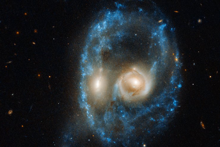 Система AM 2026-424 находится в 700 млн световых лет от Земли. Она сформировалась в результате столкновения двух галактик. Каждый "глаз" на призрачном лице — это ядро одной из галактик. Контур лица формируют молодые звезды, а нос и рот — другие звездные скопления. Спустя 1–2 млрд лет галактики полностью сольются.