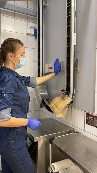 Робот выполняет работу по транспортировке заказов к работнику ресторана возле экспресс-окна, а тот уже выдает пакет с едой клиенту. Время транспортировке заказа составляет всего 21 секунду.