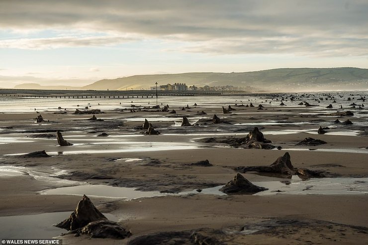 В 2014 году на пляже Борта уже появлялись окаменевшие пеньки, высотой до голени, но вскоре их снова занесло песком. В мае прошлого года ураган Ханна налетела на Уэльс, и из-под воды показалось чуть больше пеньков.