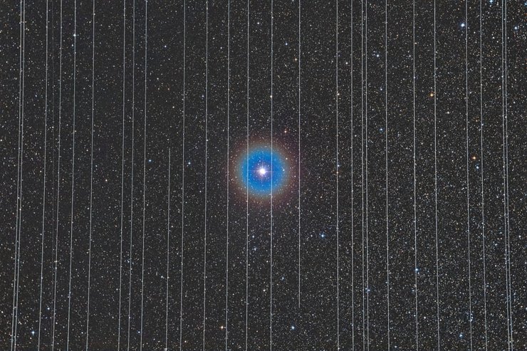 Двойная звезда Альбирео в окружении следов летящих спутников.