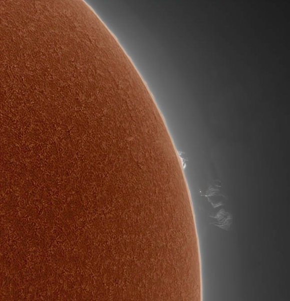 Это снимок Солнца, сделанный в Лондоне в сентябре 2019 года. Это композиция из двух изображений: на одном изображены солнечные протуберанцы, а на другом - солнечный диск.