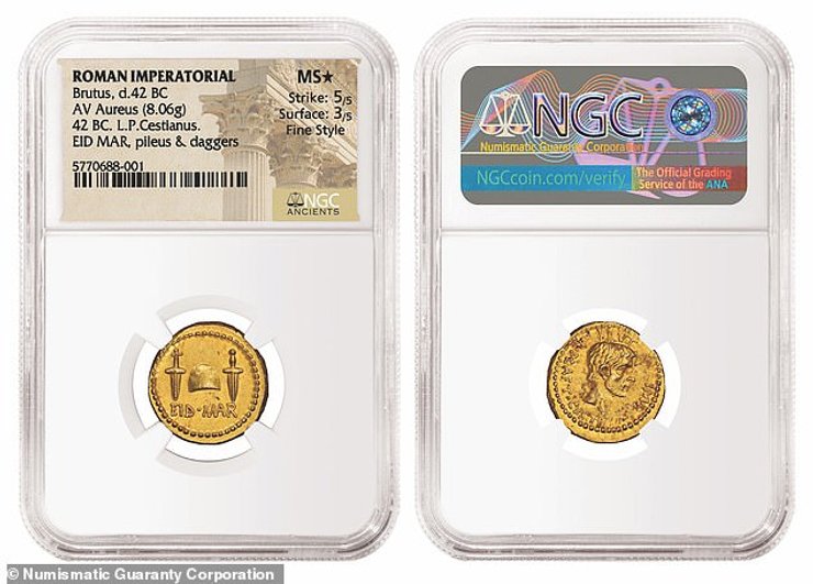 Монета была изготовлена спустя два года после убийства Юлия Цезаря 60 римскими сенаторами. Всего, считают эксперты, существовало около ста подобных монет. Часть была отчеканена из серебра, часть из золота, современники описывали их чеканку, как "открытое и бессовестное" празднование смерти Юлия Цезаря.