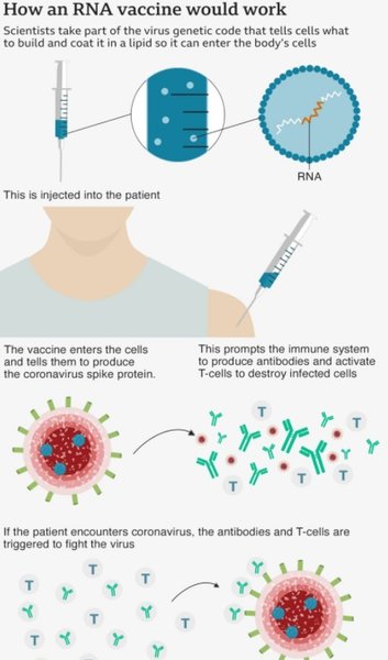 Вакцина Moderna, состоящая из двух доз, вводит в организм генетический материал, называемый мРНК, который клетки используют для выработки шиповидного белка, его вирус использует для проникновения в клетки. Шиповидный белок покрывает вирус и является одной из основных мишеней для иммунного ответа организма, направленного на уничтожение инфекции.