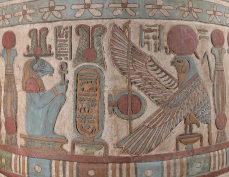 Во время реставрации исследователи очистили древние резные сцены с изображением созвездий, в том числе Большой Медведицы и Ориона. Ученые также нашли ранее неизвестные созвездия, в том числе созвездие под названием "Апеду н Ра" или "гуси Ра", которые являются древнеегипетскими богами Солнца.