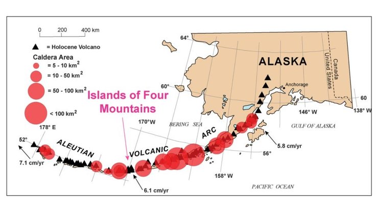 Речь идет об архипелаге Алеутские острова на Аляске. Шесть стратовулканов известны как Четырехсопочные острова (Islands of Four Mountains). Все они могут быть соединены одной кальдерой – обширной циркообразной котловиной вулканического происхождения. Она может содержать сразу несколько жерл, согласно исследованию.