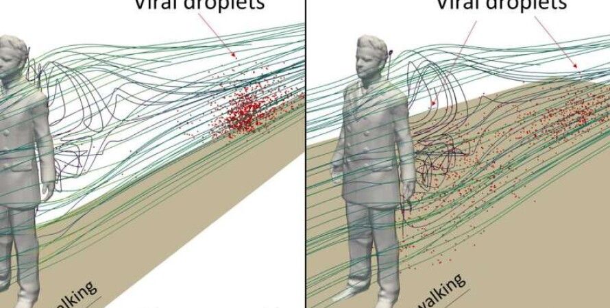 Ученые обнаружили два типа распространения. В одном из них облако капель отделяется от движущегося человека и движется за ним, создавая плавающий пузырь из капель с вирусом. В другом случае облако прикрепляется к спине человека и тянется за ним как хвост.