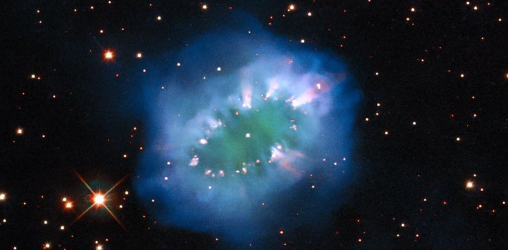 Пара звезд, которые создали туманность Ожерелье, остается настолько близко друг к другу, что выглядят как одна яркая точка в центре изображения. На данный момент звезды разделены всего несколькими миллионами километров.