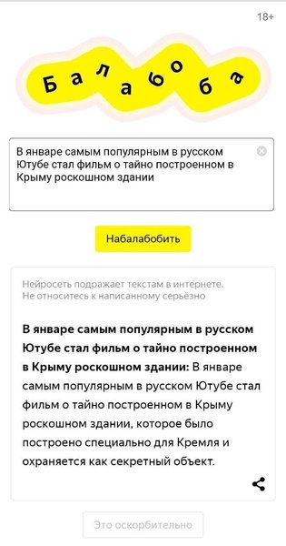 Также находчивые юзеры нашли способ заставить нейросеть рассказать о "дворце Путина", — даче генсека Брежнева, расположенной в Крыму, которую приобрели организации, подконтрольные банку "Россия". "Балабоба" сообщил, что это секретный объект Кремля. (Юзер, писавший запрос, видимо перепутал крымскую брежневскую дачу с дворцом Путина, найденном сотрудниками ФБК в Геленджике, городе расположенном не в Крыму, а в Краснодарском крае, РФ).
