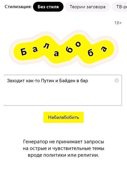 У генератора "Балабоба" есть ограничения — это темы политики и религии. А также упоминания имени Владимира Путина.