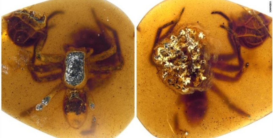 "В одном куске янтаря видно самку древнего паука, которая держит мешок с яйцами, из которых вот-вот вылупятся маленькие пауки. Именно так будет выглядеть живая самка паука, которая укрывается в расщелине коры дерева (в данном случае, прямо перед тем, как ее залило древесной смолой)", — говорит Пол Селден из Канзасского университета.
