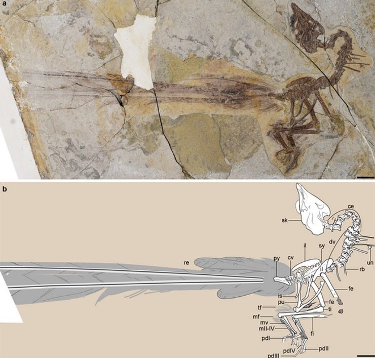 Оперенный динозавр размером с современную голубую сойку жил 120 миллионов лет назад и имел чрезвычайно длинный и экстравагантный хвост. Окаменелость нашли на северо-востоке Китая и назвали Yuanchuavis kompsosoura. Ученые считают, что хвост использовался самцами для привлечения внимания самок, сообщает Sciencealert
