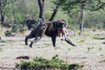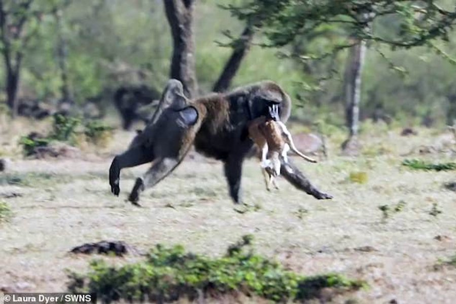 Один из них ударил газель лапой, после чего она бросилось наутек. Животное догнали, но тут неожиданно подкрался крупный бабуин и унес в своих челюстях добычу незадачливых гепардов.