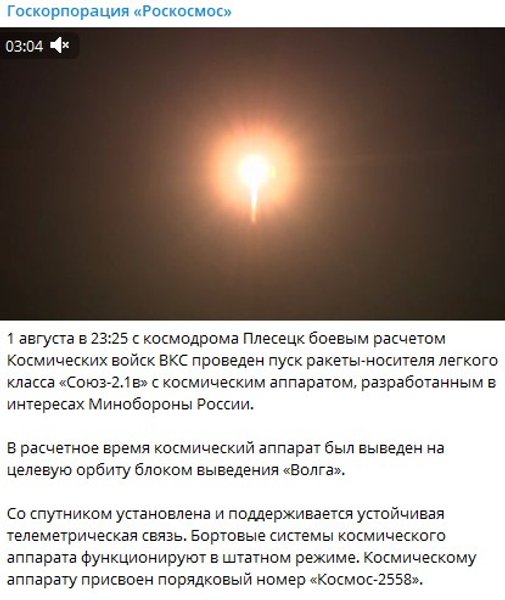 Согласно сообщению "Роскосмоса" в официальном Telegram-канале, 1 августа, незадолго до полуночи, ракета "Союз" стартовала с космодрома Плесецк с "космическим аппаратом, разработанным в интересах Минобороны России". Название этого аппарата "Космос 2558".