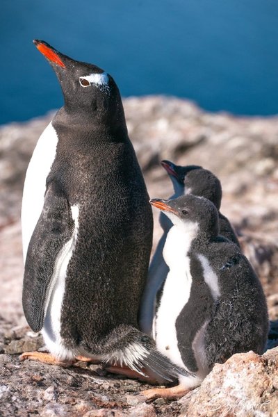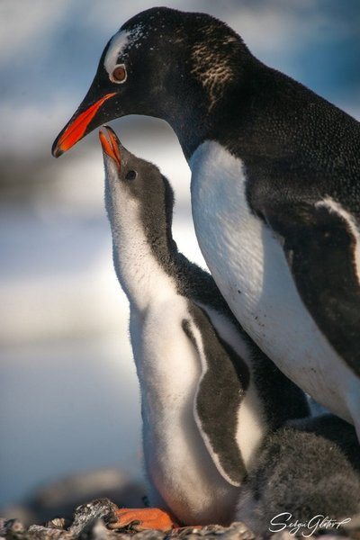 Сейчас птенцы еще остаются в гнезде. Взрослые пингвины по очереди кормят детенышей выловленным в океане крилем из своих клювов.