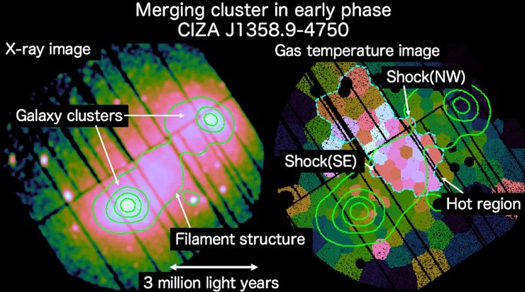 "Анализ собранных ранее данных дал возможность обнаружить две новорожденные гигантские ударные волны в сливающихся друг с другом скоплениях. Ударные волны в ширину и глубину в 30 раз больше, чем диаметр нашей галактики Млечный Путь", — говорит Омия.