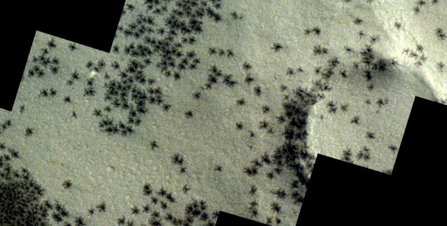 Паукообразные пятна на Марсе располагаются в южном полярном регионе. Темные пятна, конечно, не являются пауками. Они появляются на планете, когда весенний солнечный свет падает на слои углекислого газа, замершего в темные зимние месяцы.
