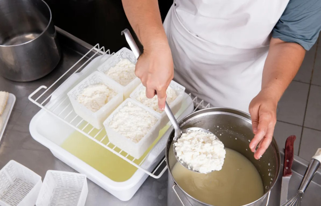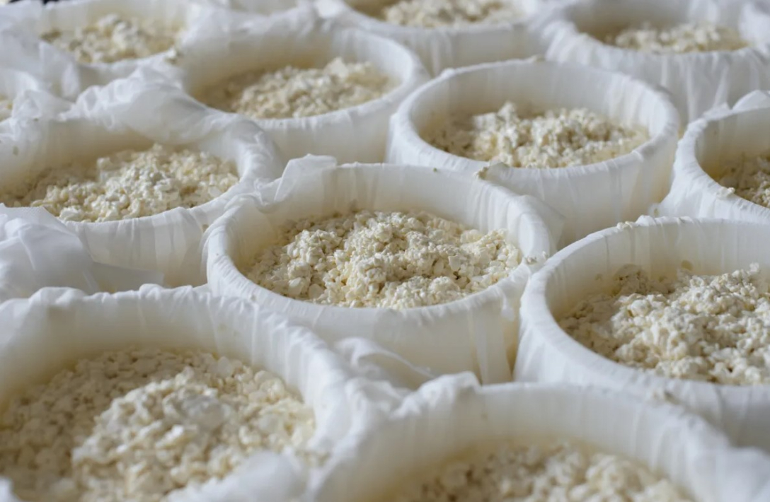 Далее смесь ферментируется, а по мере роста и деления бактерий лактоза в молоке становится для них источником энергии. Метаболизм лактозы снижает кислотность до тех пор, пока смесь не станет достаточно кислой, чтобы фермент химозин стал активным, вызвав свертывание казеинового белка и молока. В результате этого образуется твердый творог, который можно снять и спрессовать в формы для созревания.