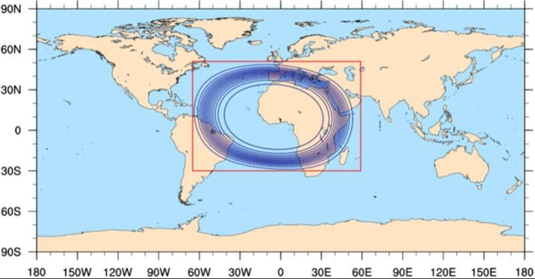Иллюстрация сетки с переменным разрешением от 15 до 3 км и конфигурации области ограниченной площади (красный квадрат), созданной с помощью инструментов MPAS