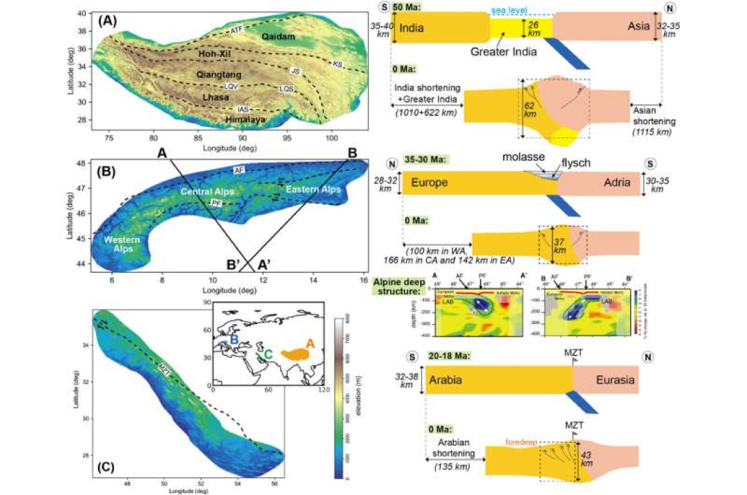 Отметим, что горные хребты являются поверхностными проявлениями утолщенной коры Земли. Три такие зоны столкновения образуют Гималайско-Тибетское плато, Европейские Альпы и горы Загрос в Иране, Ираке и Турции, возникшие в кайнозое — в течение последних 66 миллионов лет. В новом исследовании ученые впервые попытались количественно оценить количество континентальной коры, потерянной в земной мантии, когда происходит столкновение двух плит на границе каждой из них.