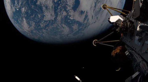 На фотографии видна Земля, часть модуля Athena, а также внизу видна верхняя ступень ракеты Falcon 9