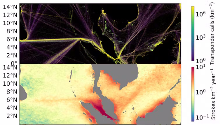 Теперь научный сотрудник по атмосферным наукам в Вашингтонском университете Крис Райт с коллегами использовали данные глобальной сети обнаружения молний, чтобы изучить, как выхлопные шлейфы с кораблей связаны с увеличением частоты молний.